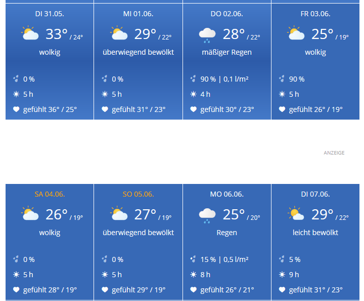 So wie sich das momentan abzeichnet, muss ich wohl noch eine kurze Hose mehr einpacken. Aber was wäre ein Urlaub ohne Regen 🙂 Naja, die Regenjacke liegt schon bereit zum einpacken. Aber ehrlich gesagt, 30 Grad und mehr braucht es nun auch nicht, wenn ich durch die Stadt, die niemals schläft, ziehe. Und, dass da immer etwas von Wolken steht, gefällt mir für die Tage mit den Aussichtsplattformen auch nicht so richtig.