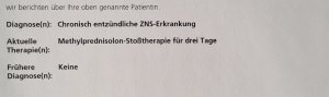Da seien Anzeichen für eine chronische Nervenentzündung, aber ob es tatsächlich MS sei, müssten die noch fehlenden Ergebnisse sagen. Bisher könnte man nur sagen, dass die bisherigen Ergebnisse nicht eindeutig sind. Nichts desto trotz sollte ich schnellstmöglich einen Termin beim Neurologen machen. Den Rest des Jahres würde er mich jetzt erst mal krank schreiben. Das Cortison müsse seine Arbeit machen, das würde ein bisschen Zeit brauchen.
